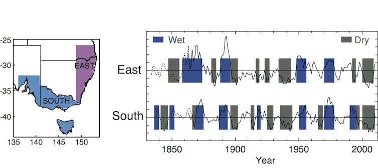 Most of these periods are associated with El Niño and La Niña events: dry conditions in southeastern Australia are generally linked to El Niño, while wet years often coincide with La Niña. However, this is not always the case. Previous studies have found a breakdown in the relationship in the mid-20th century, and natural palaeoclimate records suggest a similar breakdown in the early 1800s.
