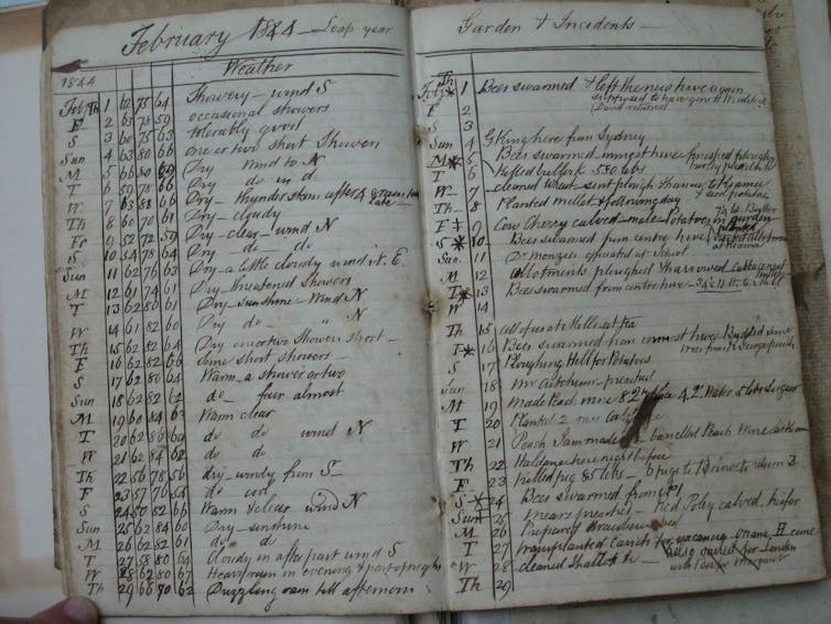 So, we went hunting for some. Over two years, we looked through newspapers, manuscripts, government documents and early settlers’ diaries from Sydney, Melbourne, Adelaide and Tasmania. We took thousands of photos of letters, journals, tables and graphs. We rediscovered handwritten observations from farmers, convicts, sailors and reverends across southeastern Australia, stretching all the way back to European settlement in 1788.