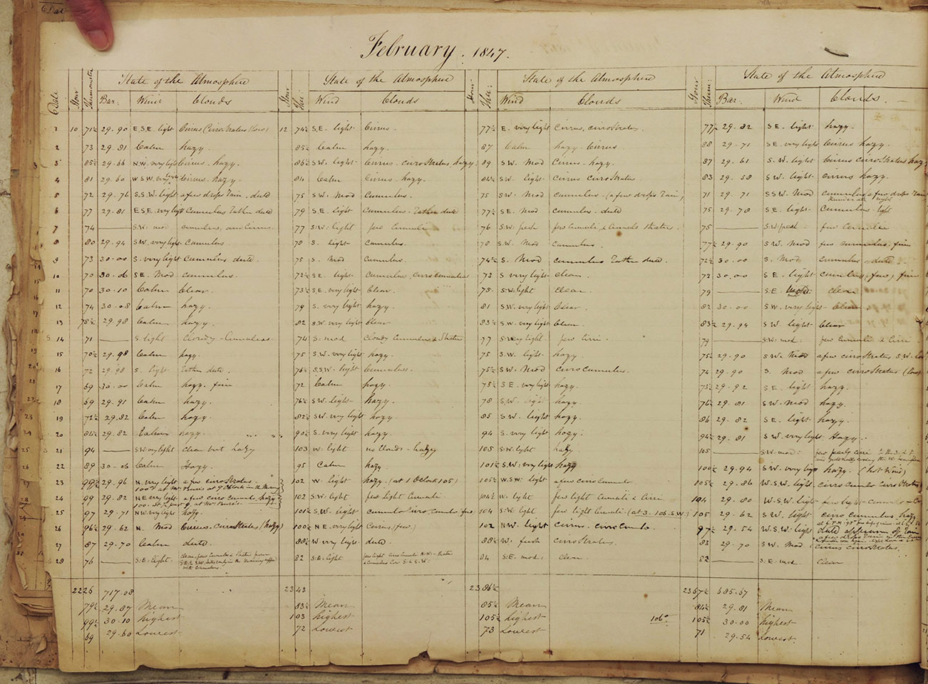 The data show that 1847 was a particularly eventful year; with heatwaves in both February and December, and a significant storm in July. We also discovered that the winters of 1846 and 1847 were unusually wet.