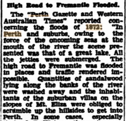 There were numerous published articles, describing how Perth and its surrounds “were deeply submerged for some days”, “all the lowlands and alluvial flats are under water”, and that “the water was about a mile wide… Traffic over Barker’s Bridge was stopped… Several families on the Bridge Estate, west of Guildford, were forced to vacate their dwellings”.