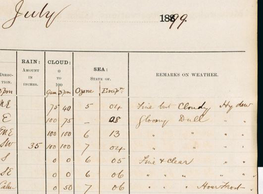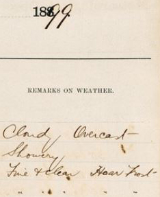 One of the volunteers on our current Zooniverse project, “BeardyBrian”, found reference to ‘Hoar frost’ in our records on July 7, 1899. By checking the original Perth Gardens weather records closely, we also found two more consecutive days of ‘hoar frost’ on August 3 and 4, 1899.