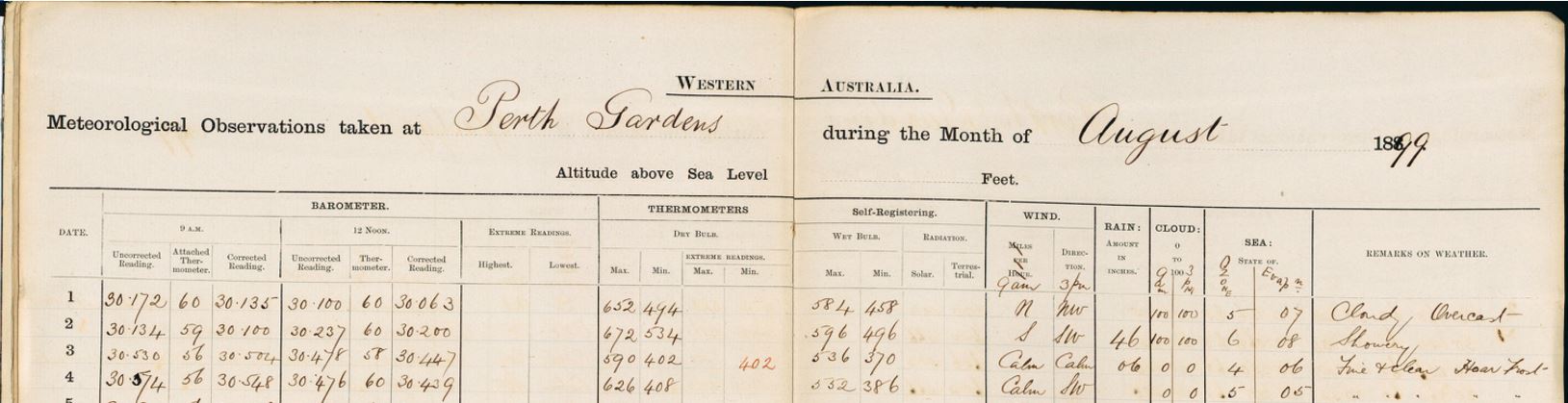 Right now, you can become a citizen scientist to help us fill a gap in Perth’s historical climate records. By recovering handwritten weather observations for the period 1880 to 1900, you’ll help connect historical data beginning in the 1830s with modern observations kept by the Australian Bureau of Meteorology. With your help, we can create one of the longest continuous weather records in the Southern Hemisphere.
