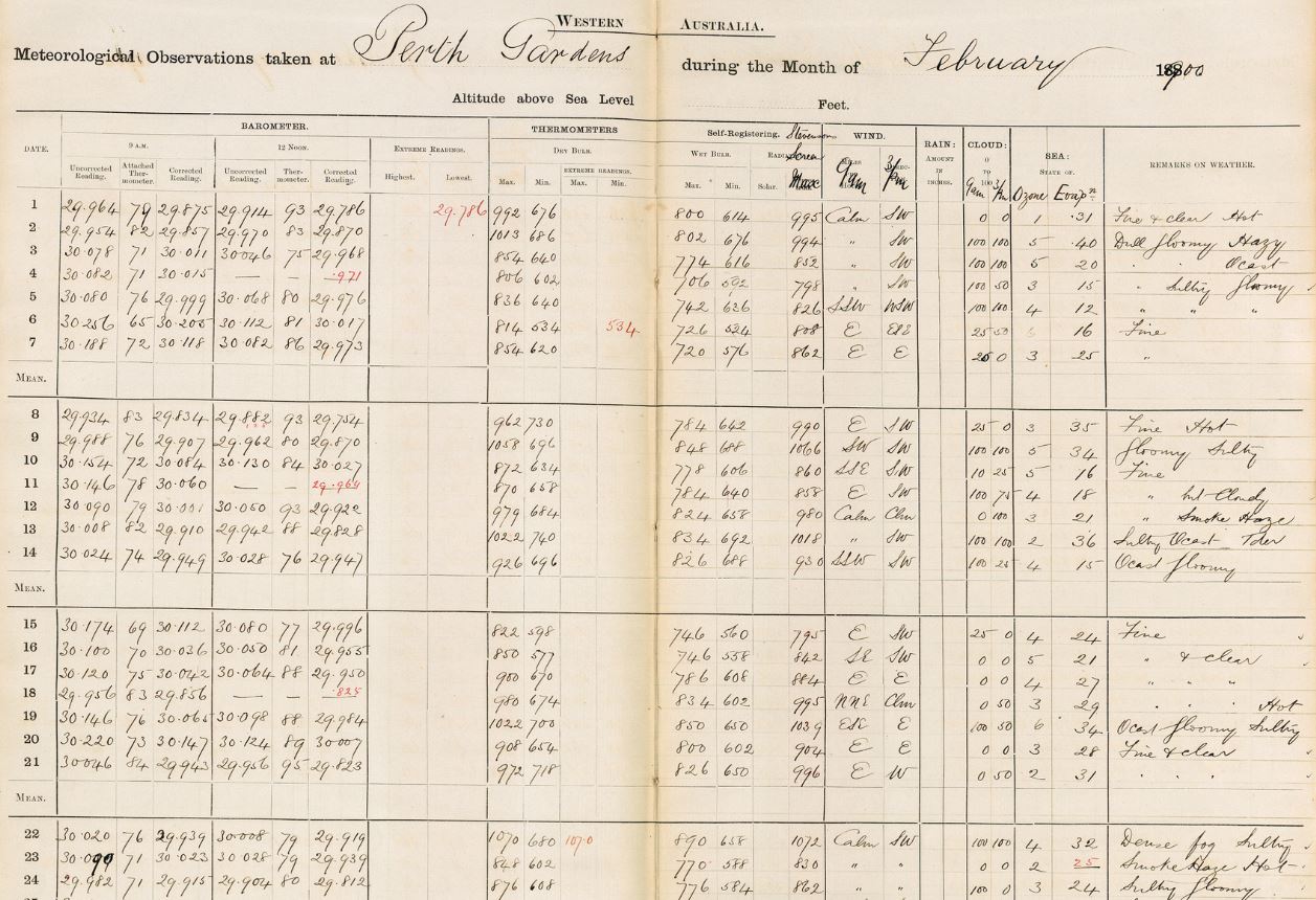 Hunt lists all of the ‘Heat Spells’ for the Perth Gardens from 1898 to 1927. On 21 Feb 1900, he notes a temperature of 107 Fahrenheit, which is the second highest ‘heat spell’ temperatures given in the 29-year period for Perth Gardens (the highest was on 14 March, 1922 at 107.6 Fahrenheit).